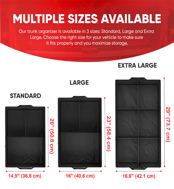 An Mála Stórála Trunk seo Le Lid Infhillte le haghaidh SUV Truck agus Sedan. Is é 57x33.5x29CM a mhéid, atá de mhéid measartha agus is féidir úsáid iomlán a bhaint as an spás taobh istigh chun freastal ar riachtanais stórála éagsúla. Meáchan an mhála stórála 1.8KG, agus úsáideann sé éadach Oxford le bord PP nó bord MDF. Is é 210D an clúdach istigh. Tá an t-ábhar sturdy agus durable, le tacaíocht mhaith agus friotaíocht caitheamh. Is féidir leis an dearadh clúdaigh deannach a chosc go héifeachtach agus príobháideacht na n-ítimí a chosaint, rud a fhágann go bhfuil stóráil míreanna sa charr níos néata agus ordúil. Thairis sin, tá sé fillte, agus is féidir é a stóráil go héasca nuair nach bhfuil sé in úsáid, rud a shábháil spás. Tá an táirge pacáistithe i mbosca de 5 phíosa, agus is é 38X32X35CM an méid cartán, atá áisiúil le haghaidh ceannach agus stóráil bhaisc, agus is rud praiticiúil é le haghaidh stórála sa charr.
